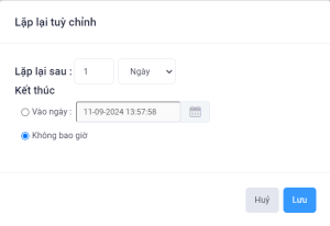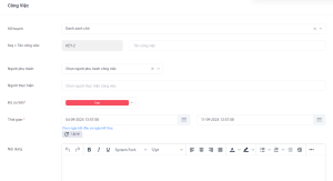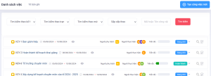 Quản lý công việc Danh sách công việc Estimated reading: 2 minutes 64 views Tổng quan Danh sách các công việc hiện có, kể cả công việc con. Hiển thị đầy đủ những thông tin cơ bản.Tính năng: Thêm mới / cập nhật / Tìm kiếmcác thao tác tương tự như thêm mới ở phần Tổng hợpĐể thêm mới công việc người dùng thao tác theo hướng dẫnBước 1: Nhấn vào tạo mới công việcbước 2: Điền tên công việc, chọn người phụ trách và người thực hiện công việc, chọn mức độ ưu tiên và thời gian thực hiện công việcTại đây khi chọn xong thời gian người dùng có thể chọn “lặp lại” công việc sau khoảng thời gian mình đưa ra, sau đó chọn ngày kết thúc việc lặp lại.Bước 3: Nhấn Lưu để lưu lại công việc.