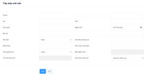 Quản lý sinh viên Tiếp nhận sinh viên Estimated reading: 1 minute 82 views Tổng quan Tiếp nhận sinh viên để thêm mới từng sinh viên vào hệ thống, người dùng thao tác theo hướng dẫnBước 1: Điền các thông tin cá nhân của sinh viên như Email, Họ, Tên, Quê Quán, v.vBước 2: Nhấn Lưu