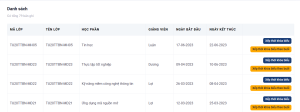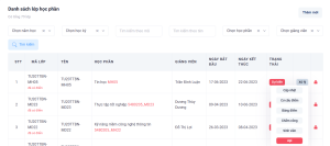 Quản lý lớp học phần bao gồm các trường thông tin cơ bản như Mã lớp, Tên lớp, Học phần giảng dạy, Giảng viên, thời gian, trạng thái và các tính năng hỗ trợ khác
