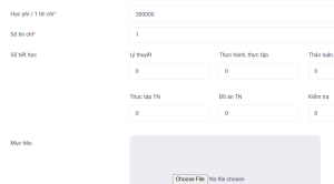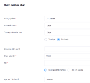 Bước 2: Điền các thông tin cơ bản về Mã học phần, Khối kiến thức, Bộ môn, Tên, Học phí/tin, Số tín chỉ,.v.v.v.v.